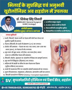The mukhbir राहुल सिंह राणा, शहडोल।जिले के मरीजों के लिए राहत और बेहतर स्वास्थ्य सेवाओं की बड़ी खबर है। अब भिलाई के प्रसिद्ध एवं अनुभवी यूरोलॉजिस्ट डॉ. शिवेन्द्र सिंह तिवारी शहडोल के SV सुपरस्पेशलिटी हॉस्पिटल एवं रिसर्च सेंटर में अपनी सेवाएं दे रहे हैं। आधुनिक तकनीक और वर्षों के अनुभव के साथ वे यूरोलॉजी से जुड़ी जटिल समस्याओं का सफल उपचार कर रहे हैं।