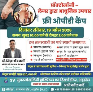 इसी दिशा में एक सराहनीय पहल करते हुए SV सुपरस्पेशलिटी हॉस्पिटल एवं रिसर्च सेंटर, शहडोल द्वारा एक निःशुल्क ओपीडी कैंप का आयोजन किया जा रहा है। यह कैंप रविवार, 19 अप्रैल 2026 को सुबह 10:00 बजे से दोपहर 2:00 बजे तक आयोजित होगा, जिसमें मरीजों को विशेषज्ञ परामर्श बिल्कुल मुफ्त प्रदान किया जाएगा।