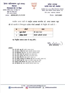 प्रदेश अध्यक्ष द्वारा जारी पत्र की प्रतिलिपि राष्ट्रीय अध्यक्ष, राष्ट्रीय महामंत्री (संगठन), प्रदेश प्रभारी, विभिन्न मोर्चों के राष्ट्रीय अध्यक्षों सहित कई वरिष्ठ नेताओं को भेजी गई है।