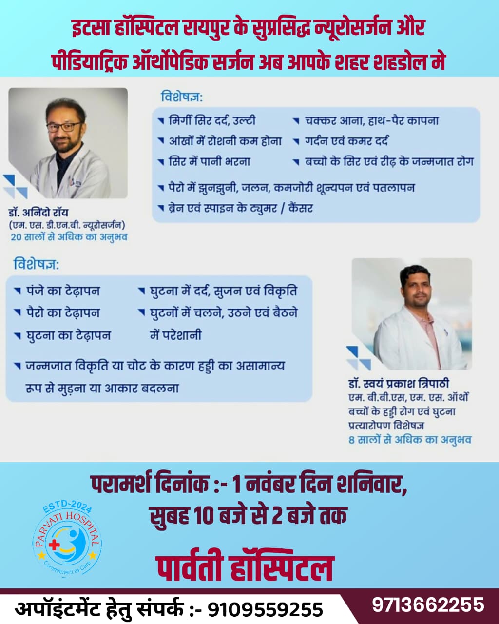 पार्वती हॉस्पिटल शहडोल में 1 नवंबर को मिलेगा विशेषज्ञों का परामर्श.